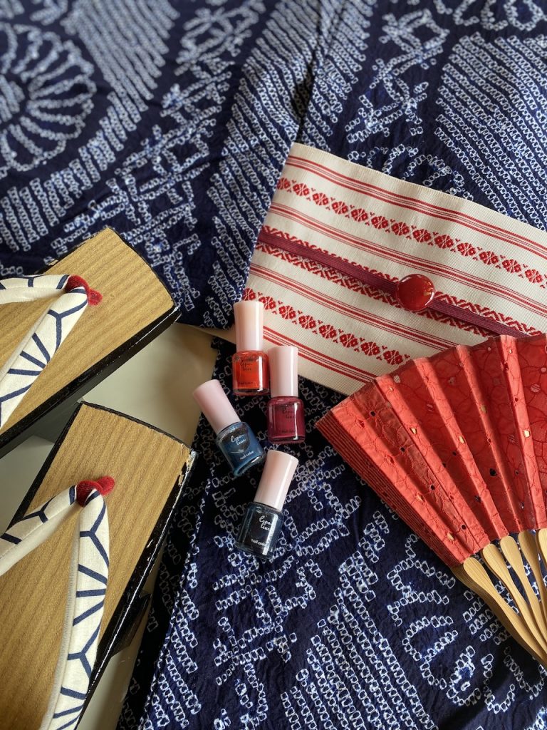 定番の紺色の浴衣に赤を差し色にしたコーディネート。赤で元気をもらいます。自分の好きな色、気分が上がる色を小さな面に重ねていくのも楽しいですよ。私は赤が好きでついつい集めてしまいます。いつもは放置も多いペティキュアも?色を揃えて、下駄の前つぼも赤をチョイス。箪笥にあった博多帯から毎年目に付く赤を集めていった感じです。