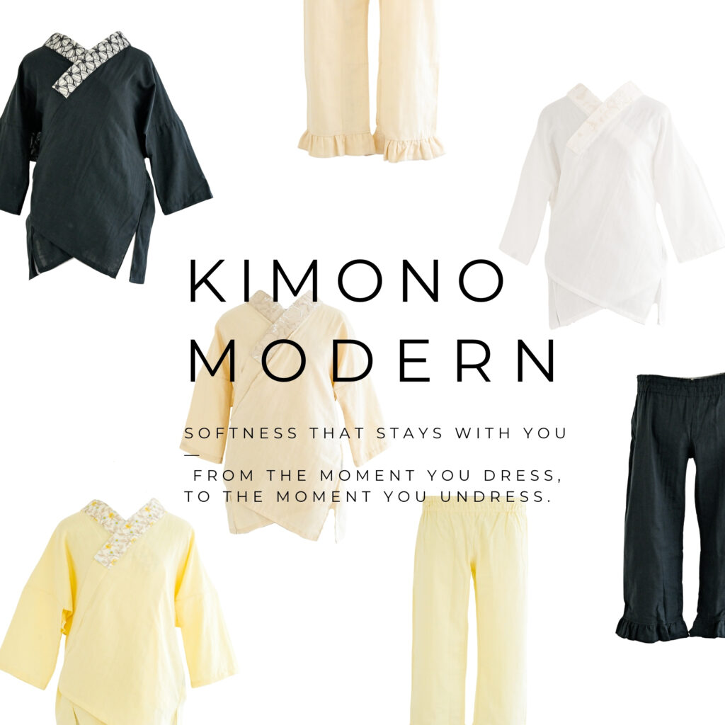 当時お付き合いしていた縫製企画メーカーさんからご提案されて「赤ちゃんガーゼのステテコ」を見せていただいた時、一気に大ファンになり、そこからKIMONO MODERNらしいボリュームを抑えた裾のフリル、そして着物着用時には欠かせない「腰履きローライズ」に改良を加え、定番大人気シリーズのダブルガーゼのステテコが誕生しました。