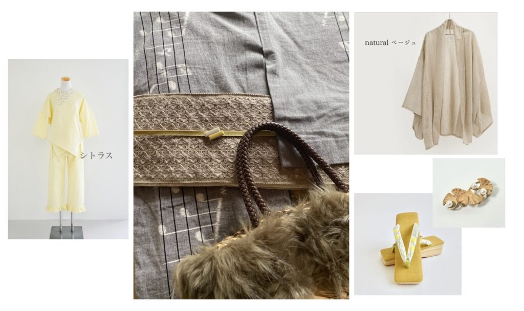 コーデアイテム:<半襦袢>赤ちゃん肌の、Wガーゼ(シトラス)/<suu帯留>オオルリ/<草履>カレンブロッソコラボ草履(ミモザ)