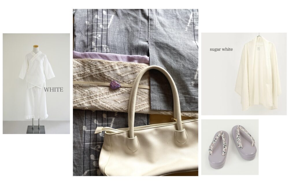 半衿の透明感を最大限引き立てるため、白い帯に淡いラベンダーの帯揚げで柔らかな印象を重ねて。着物カーディガンも「suger white」を選ぶと、木綿着物でもエレガントに引き上げられます。差し色にぴったりのお草履がありました♩