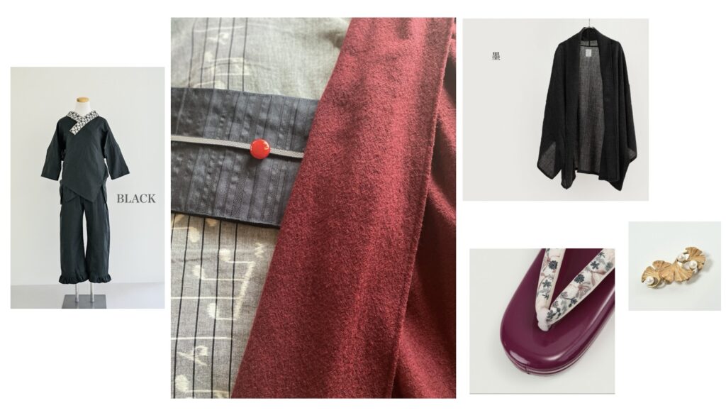 コーデアイテム:<半襦袢>赤ちゃん肌の、Wガーゼ(BLACK)/<suu帯留>鬼灯/<薄羽織>ペトルーチカ-ROSANGE
