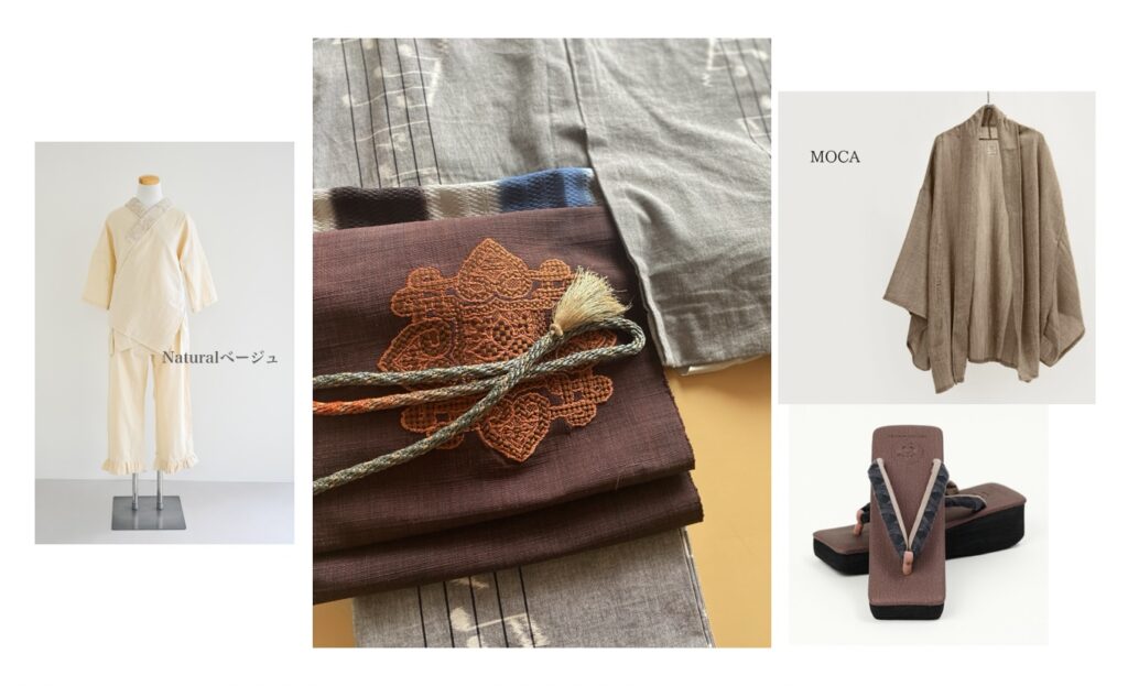コーデアイテム:<半襦袢>赤ちゃん肌の、Wガーゼ(naturalベージュ)/<着物カーディガン>MOCA/<草履>カレンブロッソコラボ草履-MOGA(レンガ)