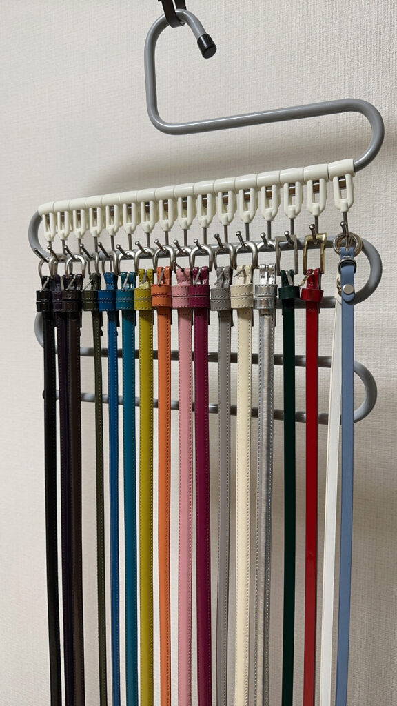 ベルト類もスラックス用ハンガーにクリップを付けて掛けて収納しています。