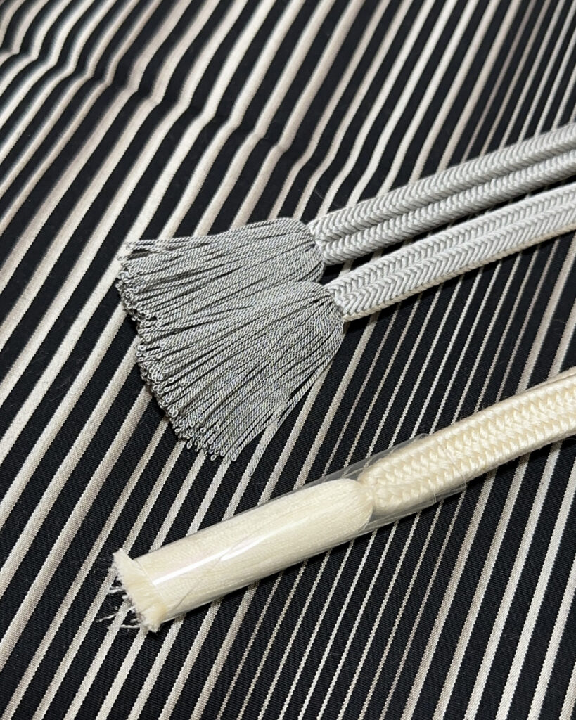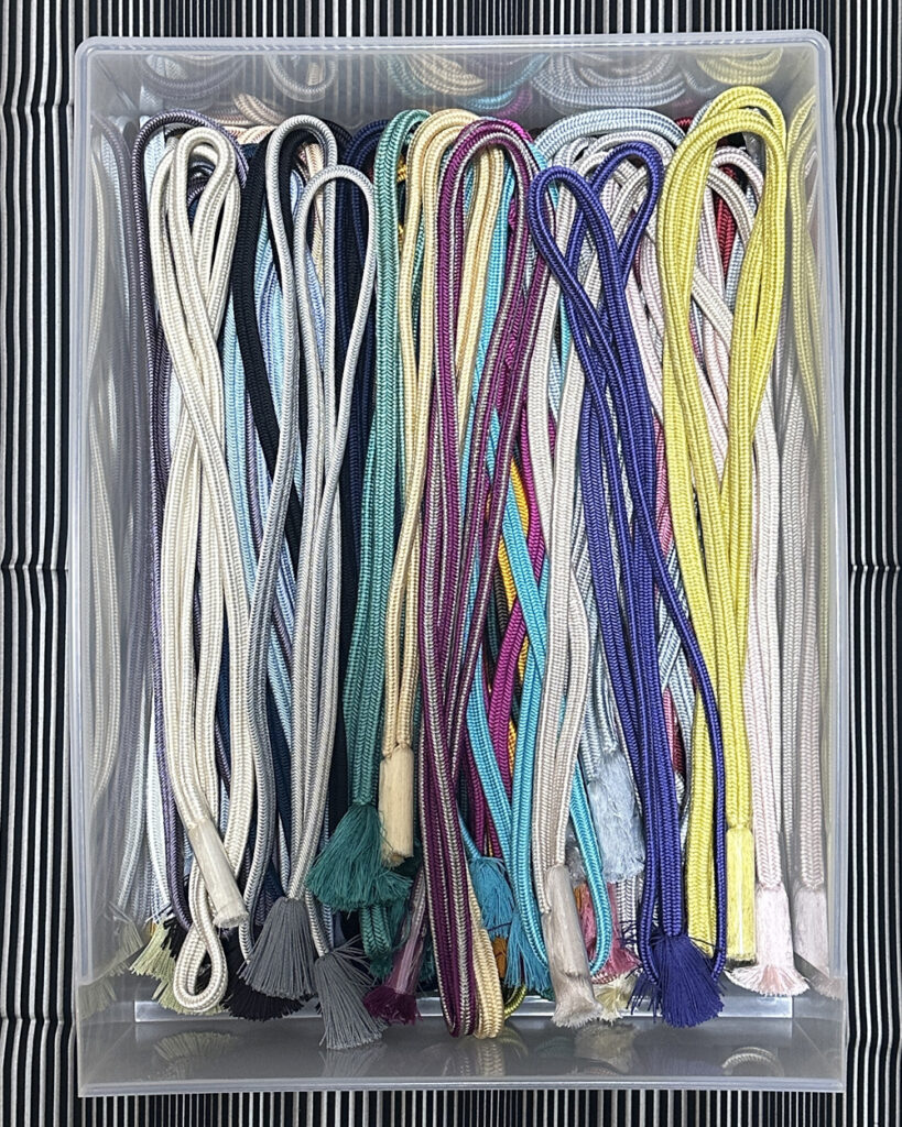 着物を収納するにあたりいろいろなライフハックはありますが、はじめにやって欲しいのは帯締の房のお手入れ。撚り房の場合はそのまま収納していますが、切り房の場合は房がばらばらにならないよう房カバーを使って収納しています。