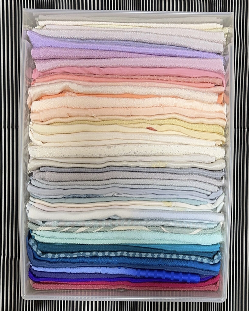 無印良品のプラケースは帯揚の幅、帯締の四分の一の長さなので、隙間なくぴったりと収納することができます。