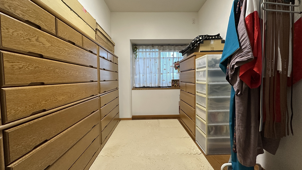 右側の1棹は洋服用の箪笥なので幅が狭く、着物は三つ折りでしか収納できないため、主にポリエステルや木綿の着物や羽織コート類を収納しています。