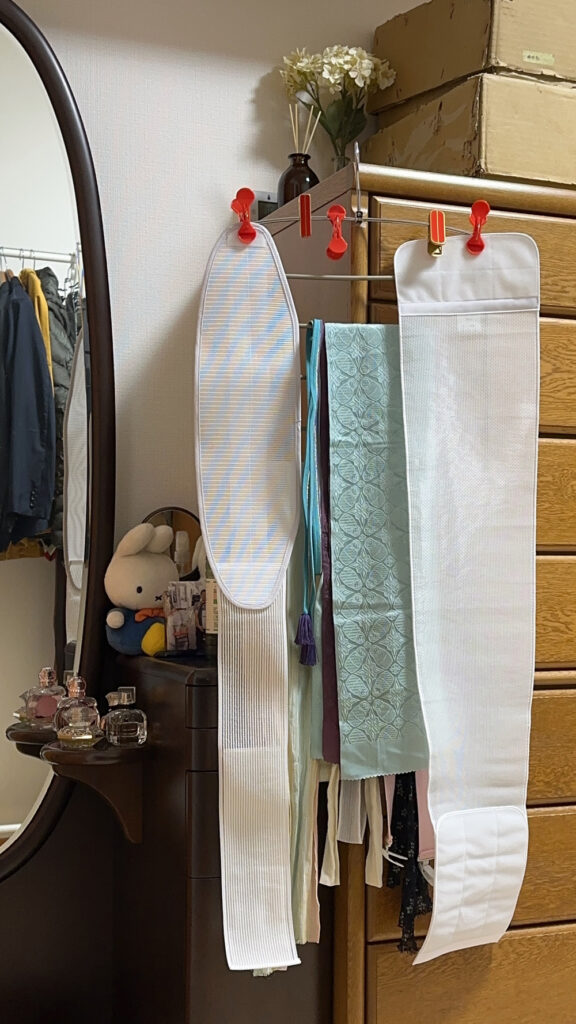 使用した着付け小物類は、鏡の横に置いている複数枚掛けられるスラックスハンガーを使ってます。
