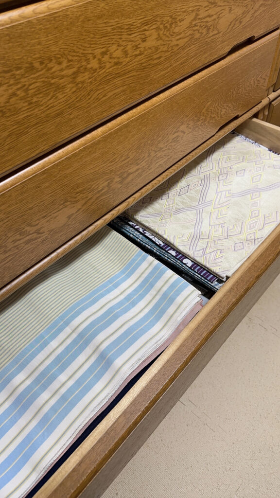 この箪笥に入っているのは正絹の着物と帯ですが、ふだんよく使う半幅帯や名古屋帯はたとう紙には入れずそのまま箪笥に入れています。