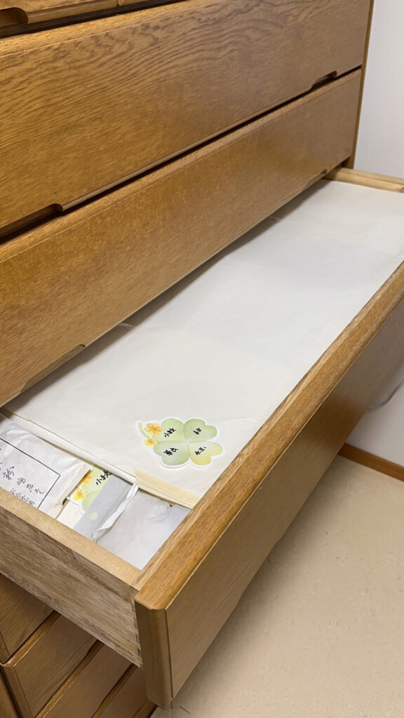 ページ冒頭の写真が実際の着物部屋なのですが、現在着物専用の箪笥が3棹あります。左側の2棹は着物を収納する目的で作ってもらった箪笥なので、たとう紙に入れた着物がちょうど入るサイズになっています。