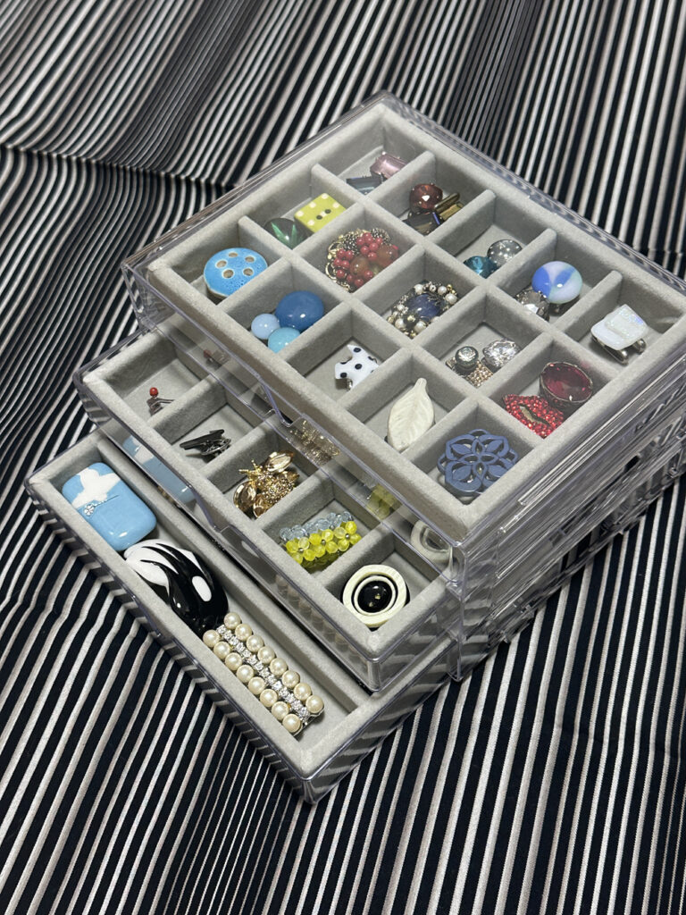 帯留の一部は100円ショップのアクリルケース+トレイを使用しています。