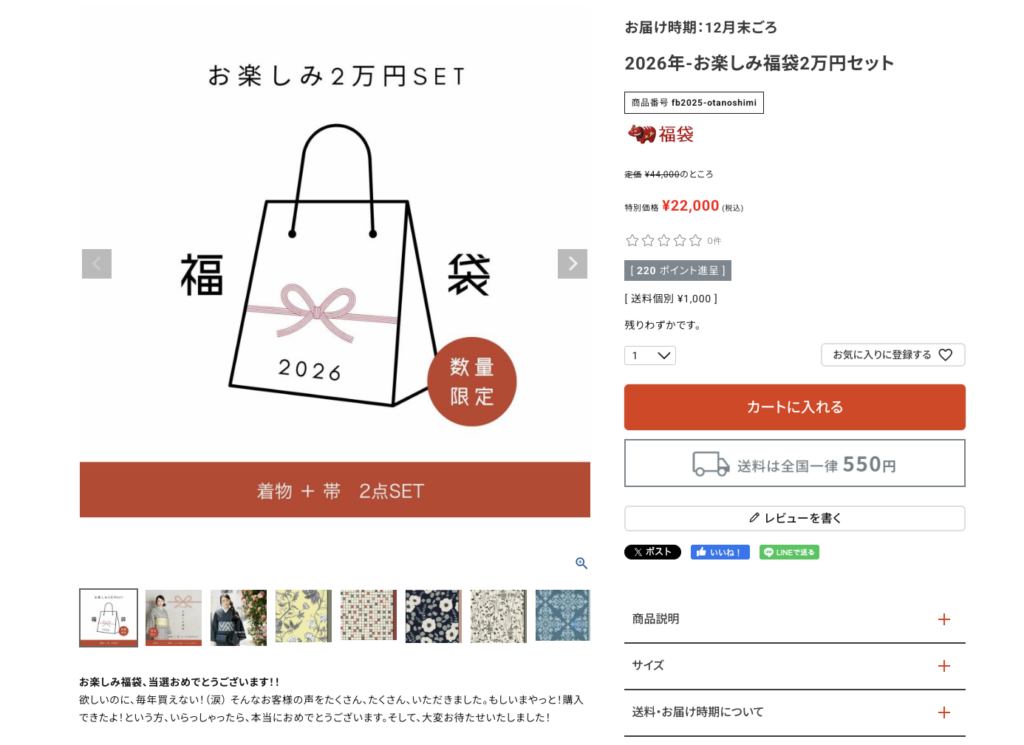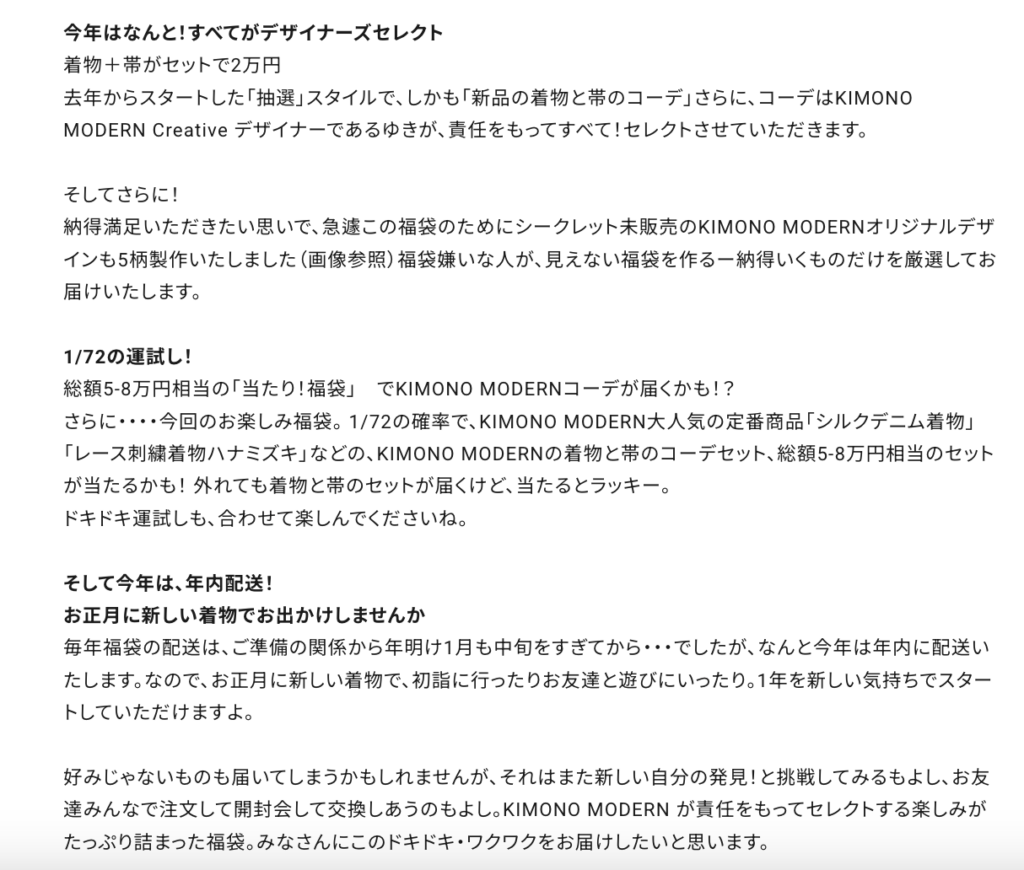 毎年争奪戦で、いつも買えない・・・というお声を多数いただいたので、去年から抽選で当選者の方のみに販売ページのURLをお送りするという方式に切り替えておりましたが、今年も抽選式で人気の福袋の販売をいたします。