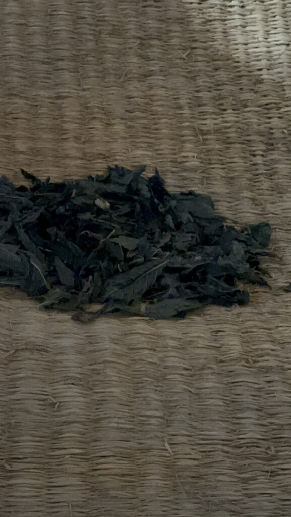 写真はごく一部ですが、実際には刈り取った山のような藍の葉をカラカラになるまで乾燥させます。