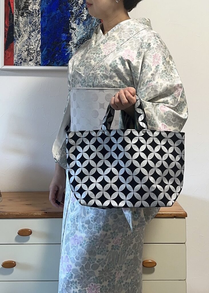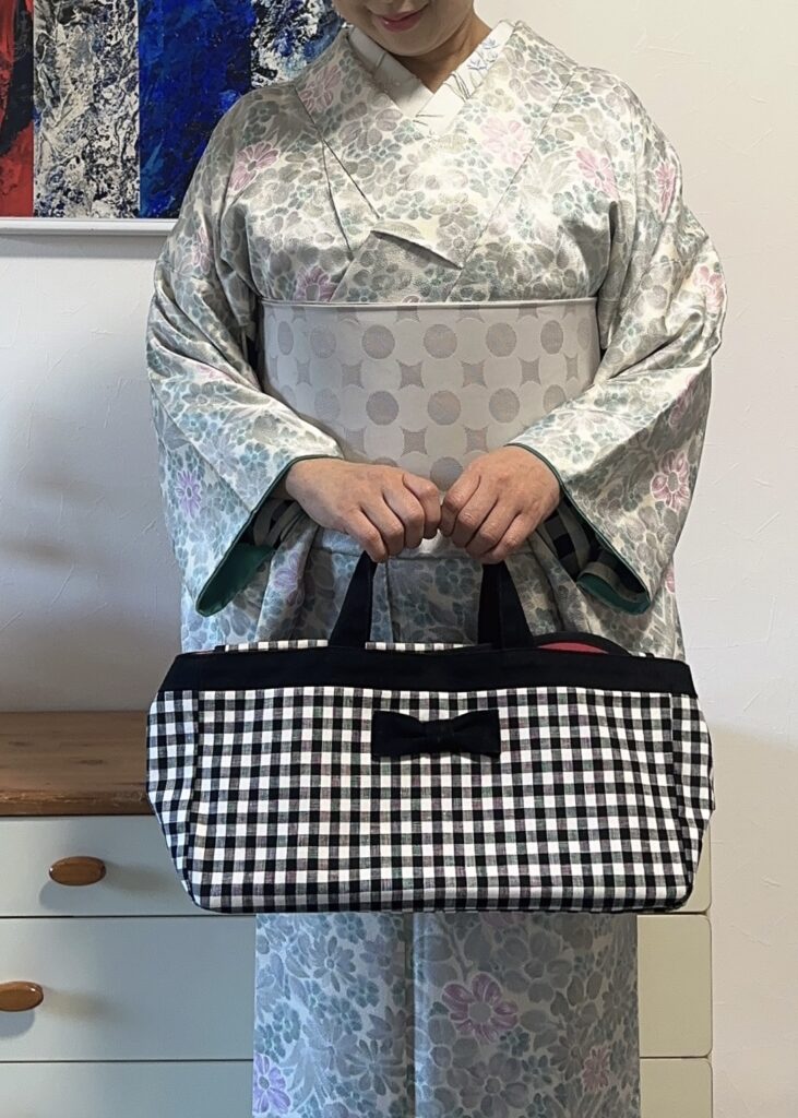 着物バッグの代表格ともいえる利休バッグは、小紋や紬には合わせやすい反面、木綿の着物だと少し改まった印象になることも。また、小ぶりなサイズが多いので「荷物が入りきらない!」という声もよく聞きます。