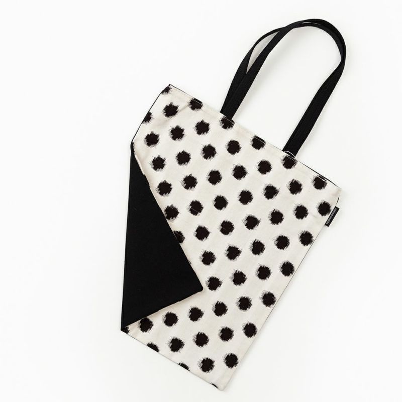 水玉文様も、久留米絣の魔法で揺らぎ、ふんわり、漂い。白と黒のコントラストがカジュアル感を引き上げる。