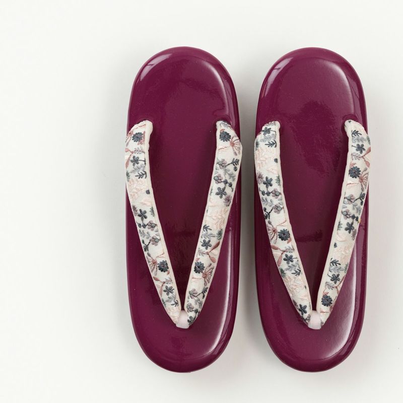 グレイッシュなラベンダーカラーが、鼻緒に控えめに咲く紫の花の色と優しくリンク。ノスタルジックで可憐な雰囲気をプラスして、大人かわいい着姿に。