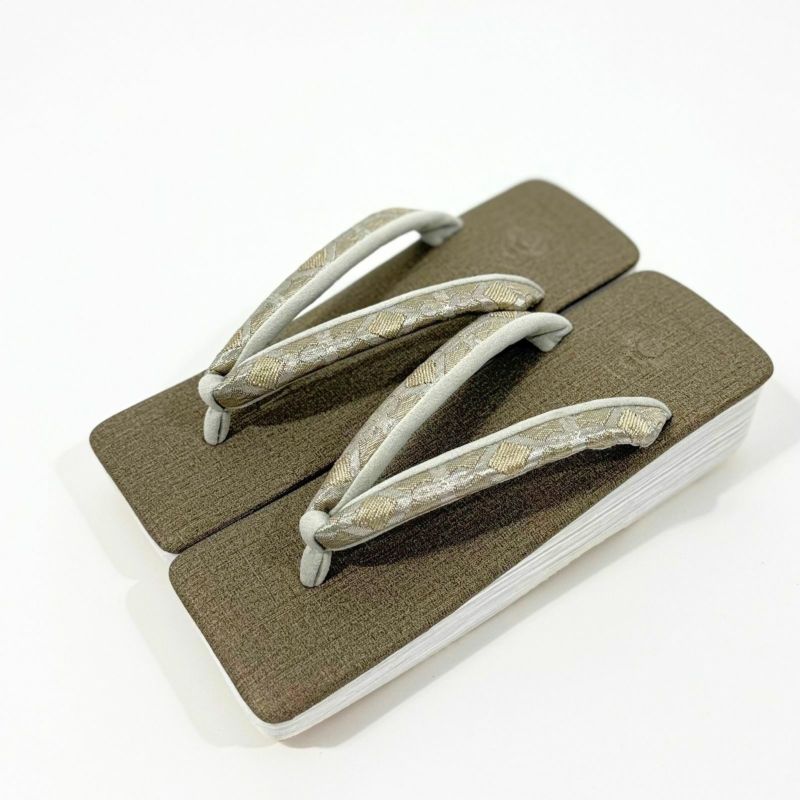 さりげない光沢のあるグレージュの台に、立体感と艶のあるエスニックな菱柄の鼻緒が、プラチナムな高級感を漂わせます。全体的にワントーンで落ち着いたカラーリングなので、どんな着物にも合うキレイめ草履として活躍しそうです。