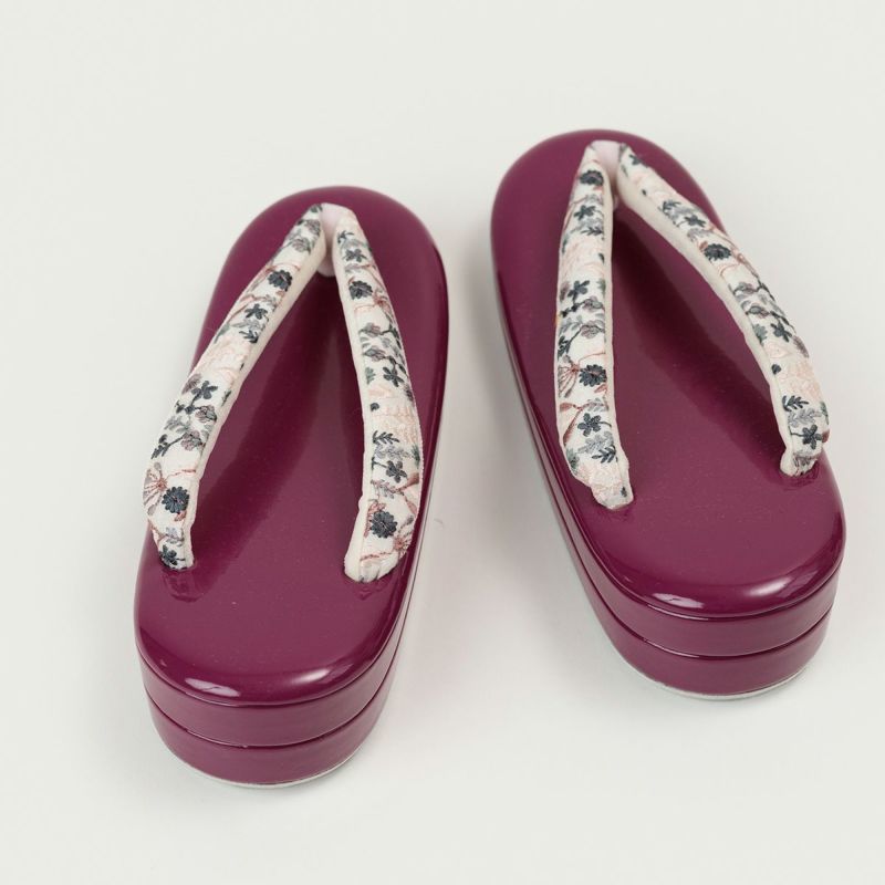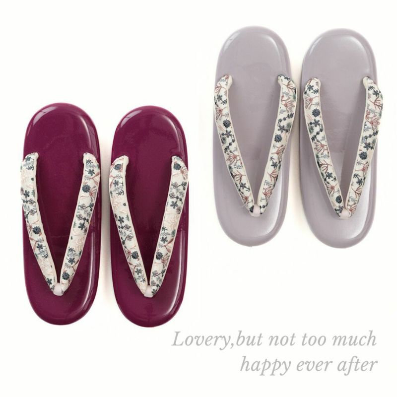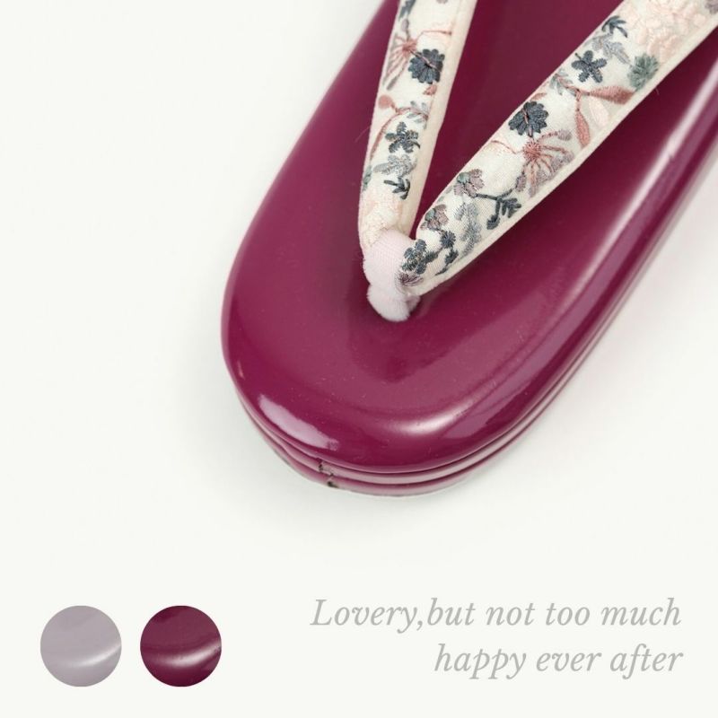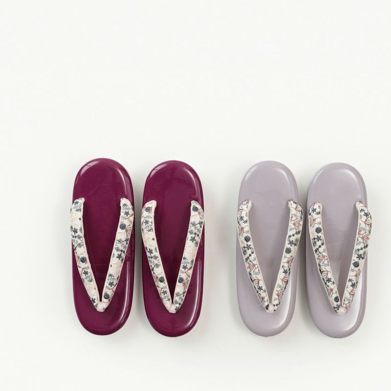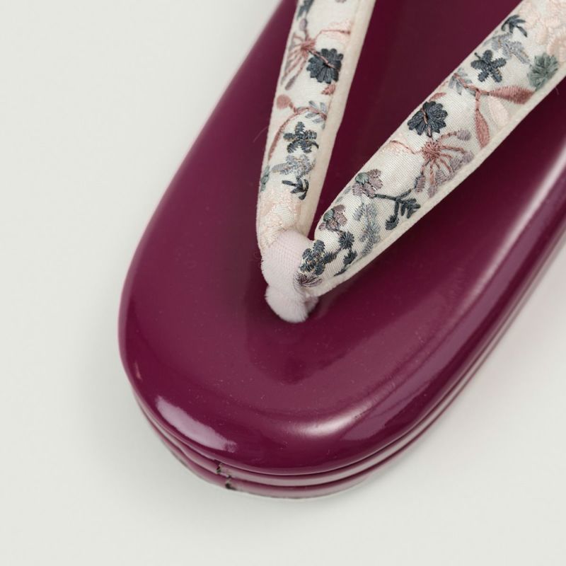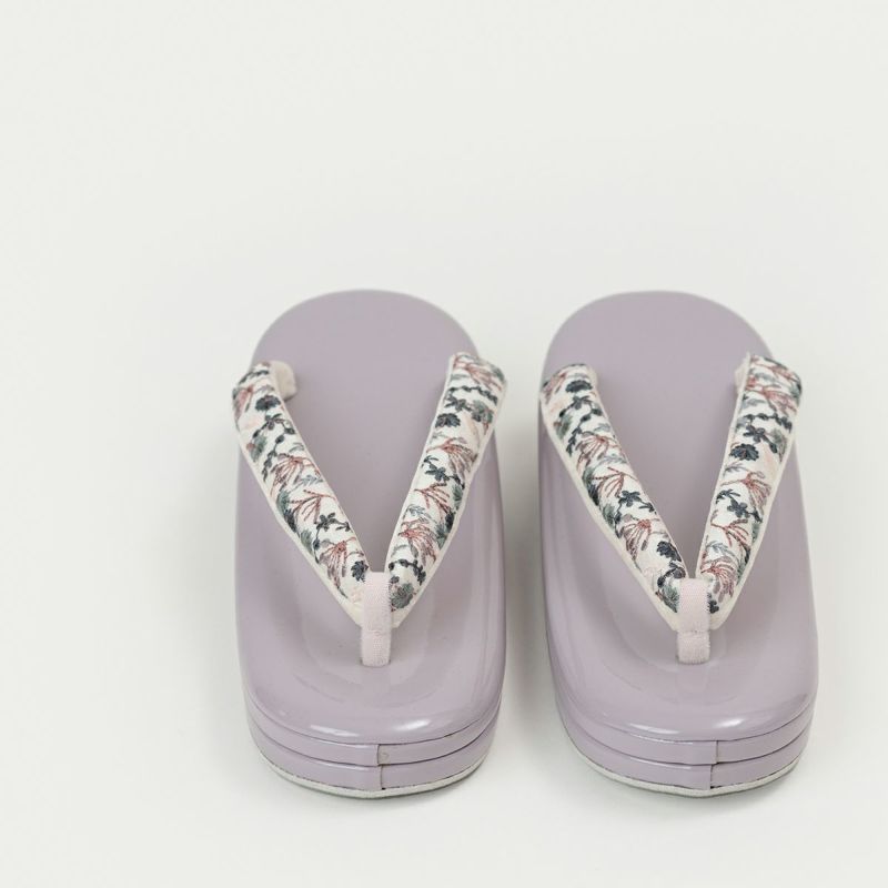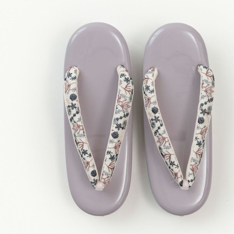 グレイッシュなラベンダーカラーが、鼻緒に控えめに咲く紫の花の色と優しくリンク。ノスタルジックで可憐な雰囲気をプラスして、大人かわいい着姿に。