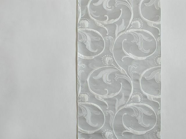 やや青みがかった艶のあるグレイッシュなトーンを地色に、艶やかな白で柄が表現されています。上品ながらも、MODERNなテイスト漂う帯。