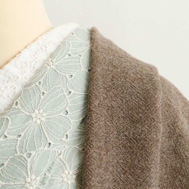ウールガーゼ(ウール100%)で薄いのに、意外と暖かいという嬉しいギャップ。細めの糸で編まれたザックリした風合いに、ふんわり軽くてやさしい手触り。それでいて ストン、と程よい落ち感と美しいドレープが、カジュアルにもきれいめにもマッチします。