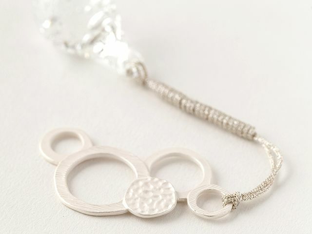 草木から零れ落ちる朝露のような、うっとりするほどクリアで奥ゆかしい、ガラスの根付です。 帯に差す板の部分までデザイン性を追求し、洗練された印象に。儚く消えてしまいそうな繊細さを、着物姿に添えて。