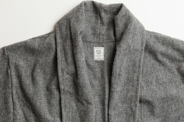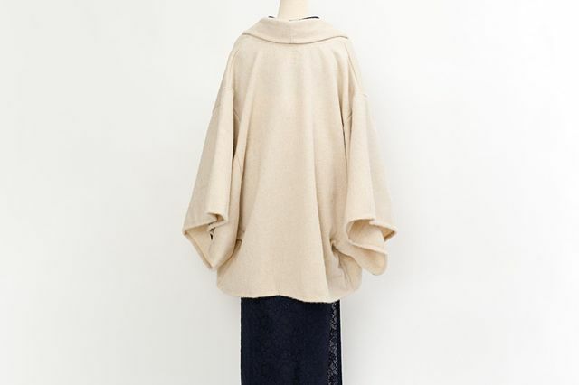 しっかりお尻の下まですっぽり覆ってくれるサイズで、ゆるりとAラインがスタイル良くみせてくれ、広め幅の衿がまるでストールをふんわりまとっているような、緩やかなドレープ感を演出してくれるので、ちょっとこなれた大人のシルエットに。カジュアルなのに高級感のあるアルパカ混素材だから、正絹キモノに合わせても安心です。