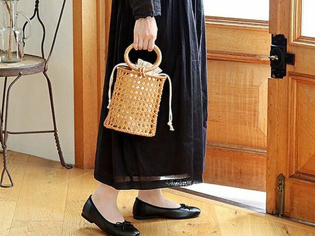 しなやかで弾力のあるラタンの皮で編まれたカゴバッグは、表面がささくれにくいというメリットも。小ぶりなサイズ感に見えますが、500mlのペットボトルとスマホやお財布もすっぽり入ります。