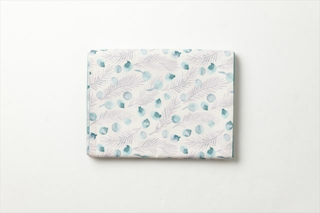 グレイッシュなトーンで柔らかに描かれた孔雀の羽根、そしてほんわり優しげな翡翠色の実。