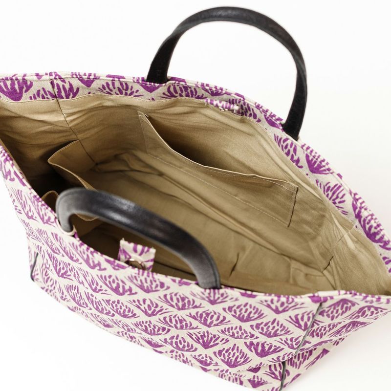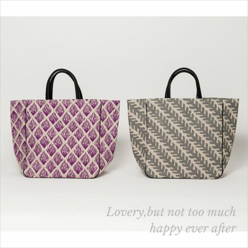 シンプルなボタニカル柄×ナチュラルな麻布でスッキリ見え。持ち手の牛皮がきちんと感も出してくれるので、和洋問わず、さりげなくコーデに取り入れられます。