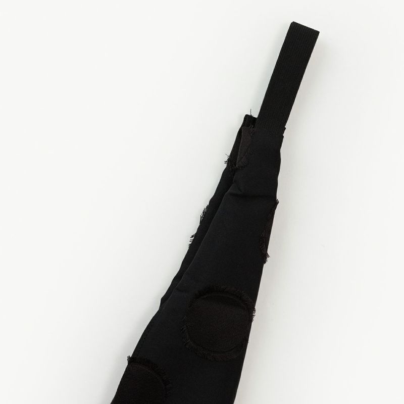 中央部分の黒いゴムの部分を首の後ろに、生地部分を頭のトップで交差させ、首の後ろでリボン結び。