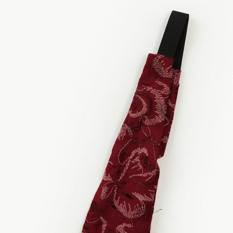 中央部分の黒いゴムの部分を首の後ろに、生地部分を頭のトップで交差させ、首の後ろでリボン結び。
