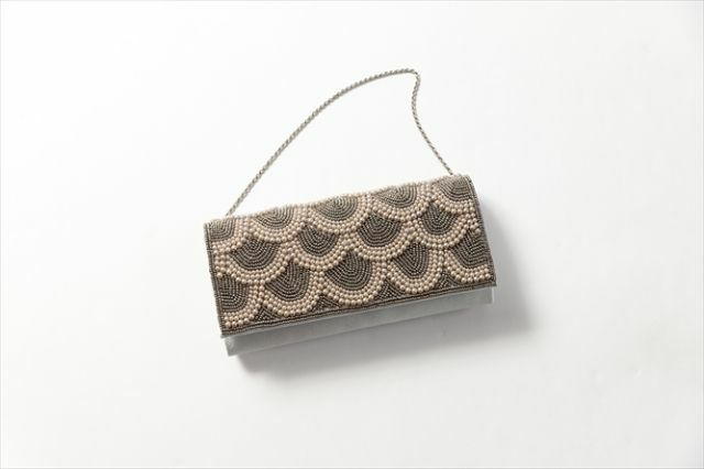 パールをたっぷりとあしらった華やかな印象のかぶせクラッチです。うろこモチーフがリズミカルで特徴的。様々なパーティーシーンで大活躍。