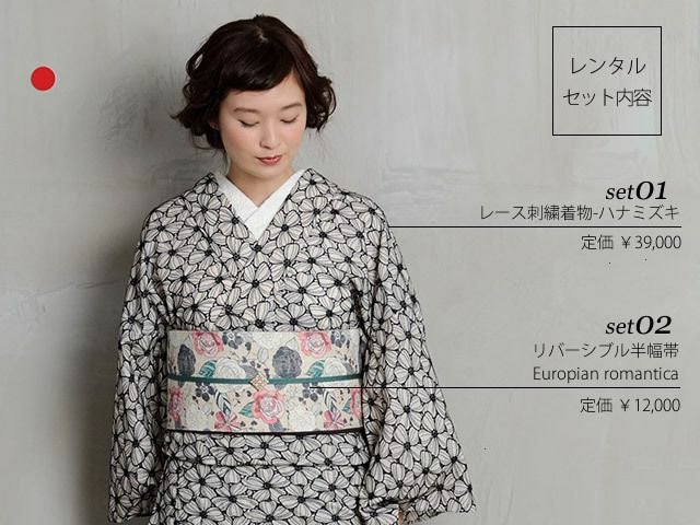 ・レース刺繍着物ーハナミズキ-アイボリー 定価39,000円 ・リバーシブル半幅帯-Europian romantica 定価12,000円