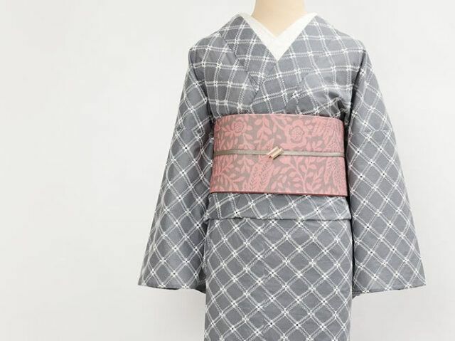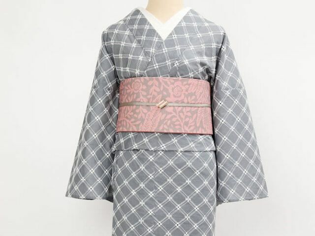 <レンタル>フレンチ格子GRAY+木綿のリバーシブル半幅帯-北欧flowers(2週間レンタル・帯のみ買取可)