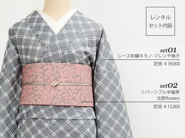 レンタルセット内容 ・レース刺繍着物-フレンチ格子 定価 39,000円