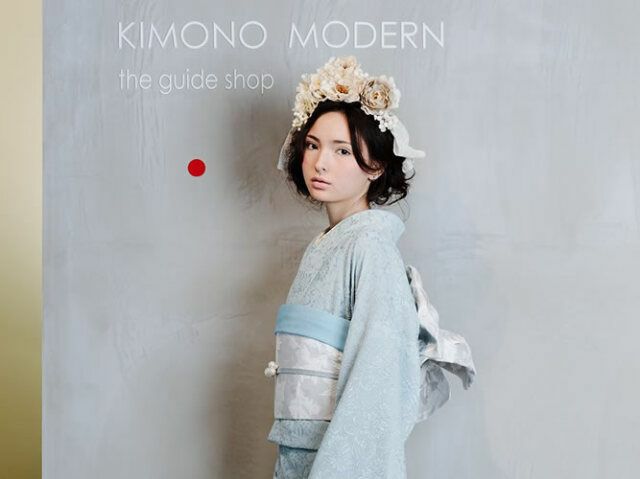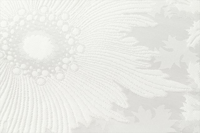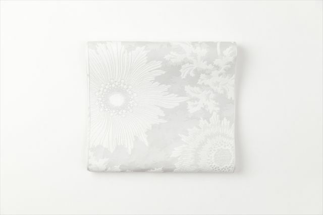 やや青みがかった艶のあるグレイッシュなトーンを地色に、艶やかな白で柄が表現されています。上品ながらも、MODERNなテイスト漂う帯。