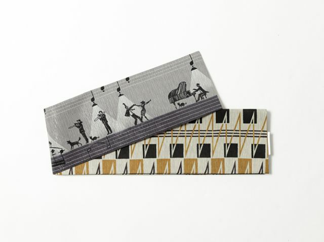 室内に流れる音楽を表現しているかのように、上下に描かれた音符模様と、ブラックとトーンを変えたいくつかのグレイが織りなす人間模様の、なんとお洒落なこと。