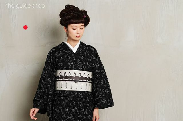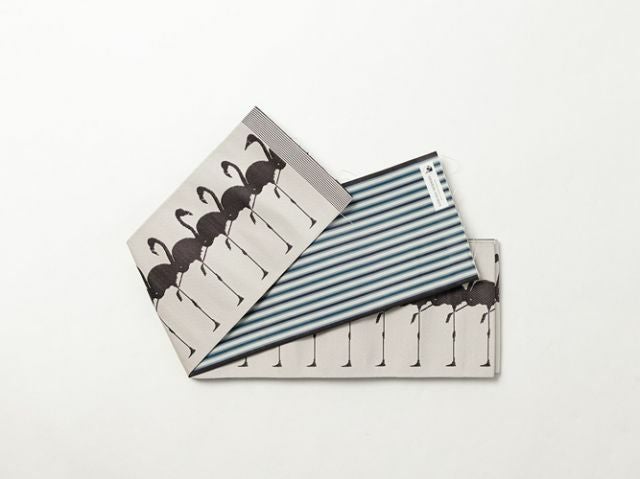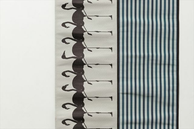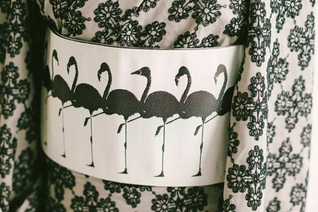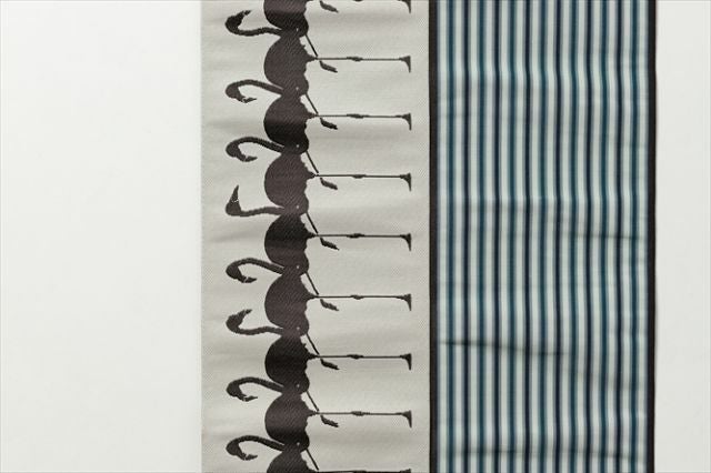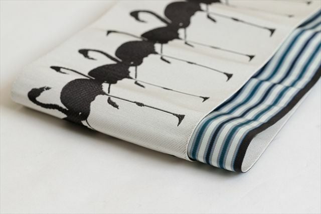スタイリッシュなフラミンゴが可愛く整列!ユニークだけど、ストライプのような柄なじみの良さをもつプレイフルな半幅帯です。アイボリーとダークブラウンの優しいコントラストも、コーディネートのしやすさをアシストしてくれます。