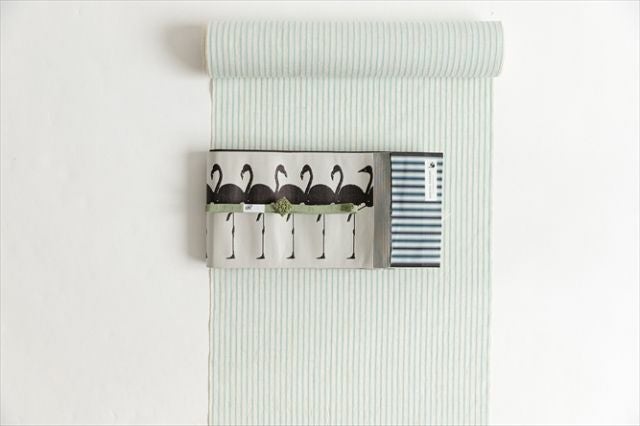 裏側はシャープな印象の寒色系ボーダー。 博多織の光沢感としなやかな質感と相まって、コーディネートにメリハリをプラスできます。ユーモアと上質感を兼ね備えたリバーシブル半幅帯は、マンネリ回避にも一役買ってくれそう。