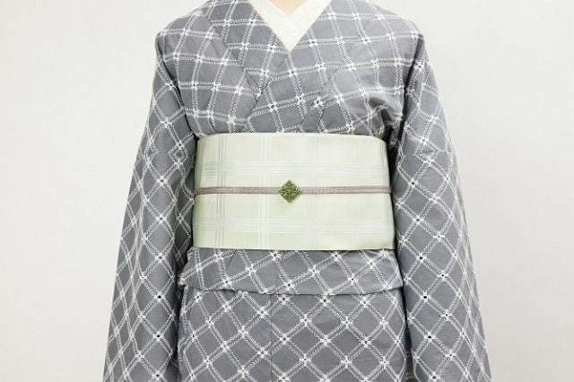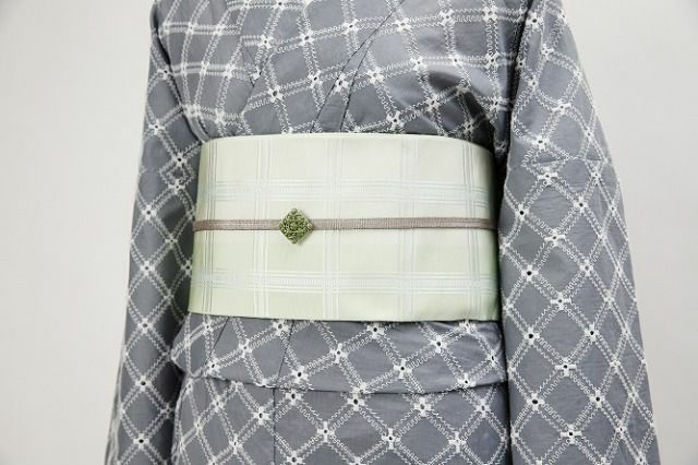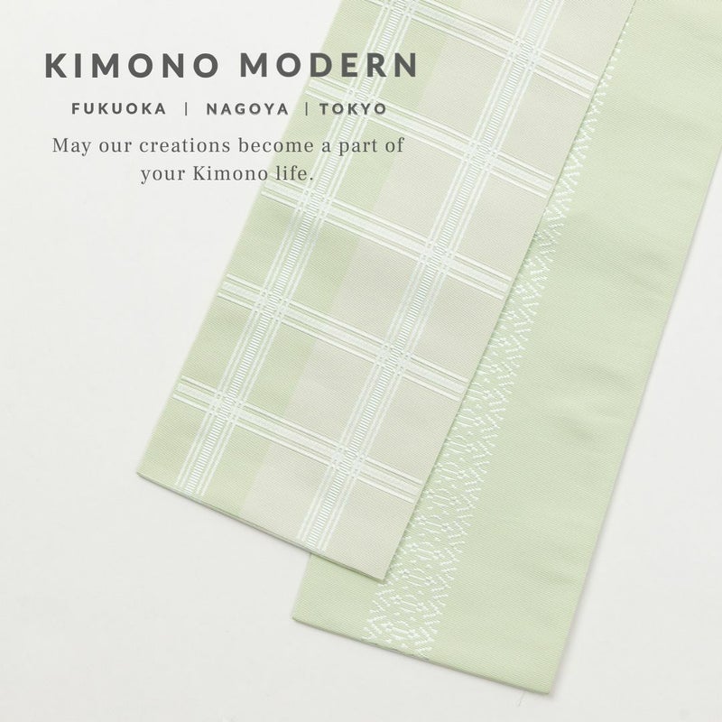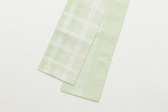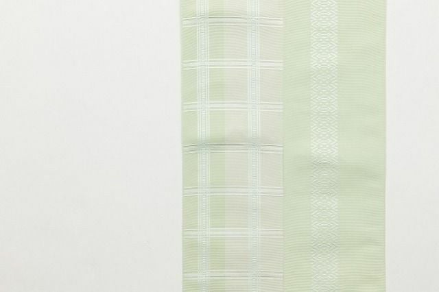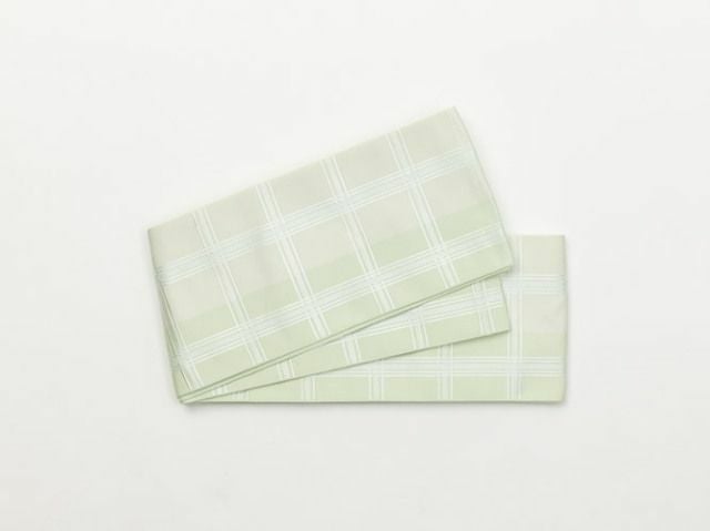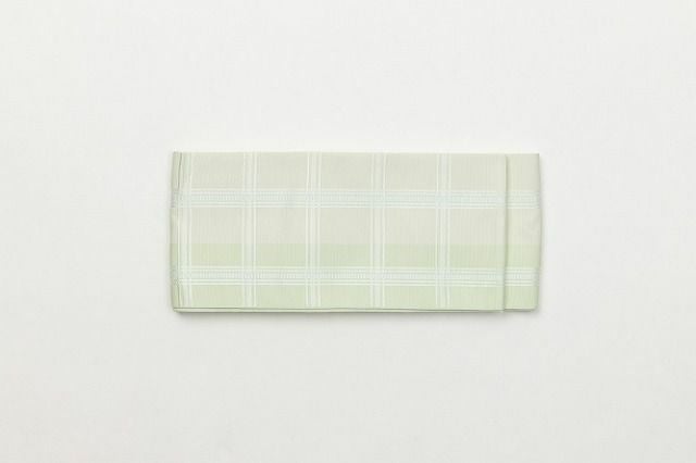 <博多織半幅帯>大判格子ー抹茶ミルク(正絹100%)