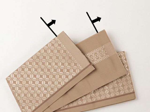 画像矢印の部分はほつれ止めの織り方となっておりますので、その部分を全部内側に折り込み、指できれいに折り目を付けてご使用ください。