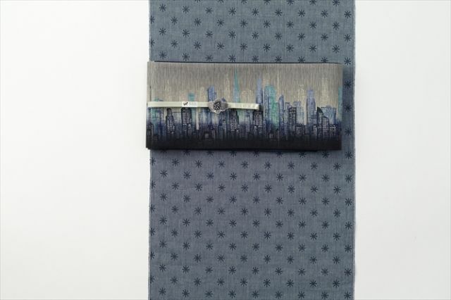 三日月の薄明りに照らされる摩天楼。大胆でモダンだけど何となく儚げで、どこか物語を感じさせる…。そんなドラマティックで粋なアプローチが効いた半幅帯が仲間入り。