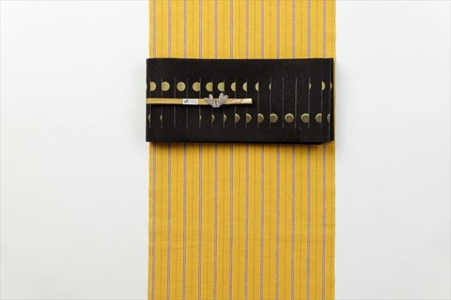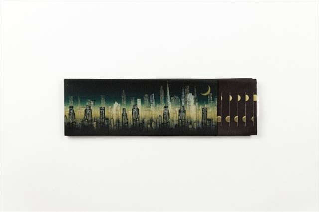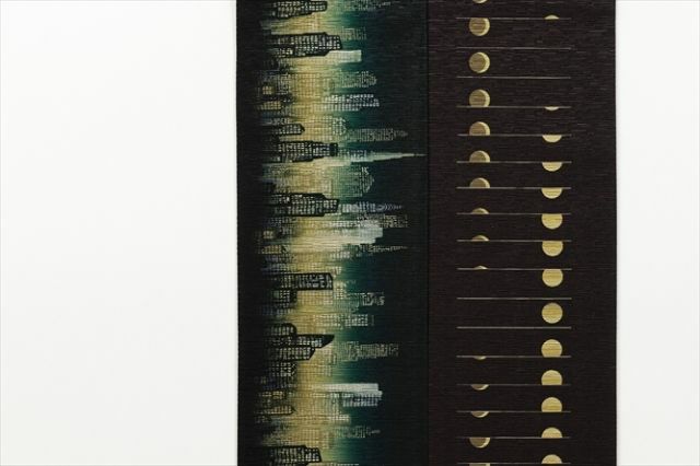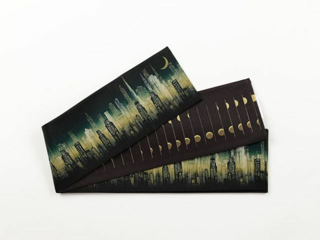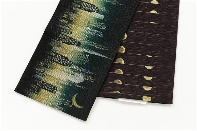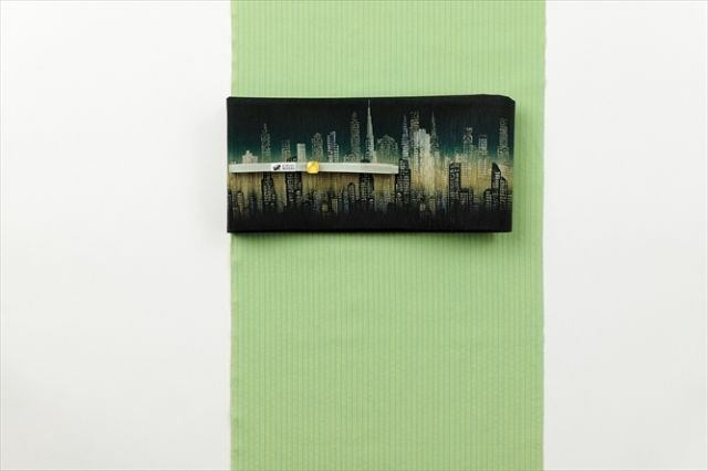 夜の帳の中で煌めく摩天楼。大胆かつモダンで、絵画的なインパクトを与える半幅帯です。