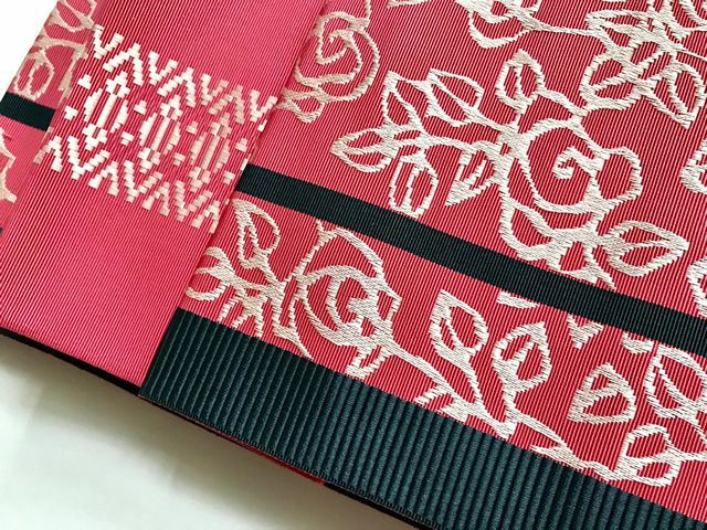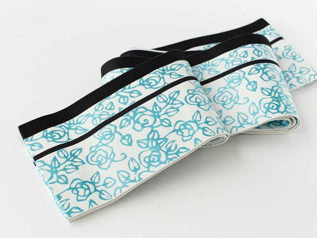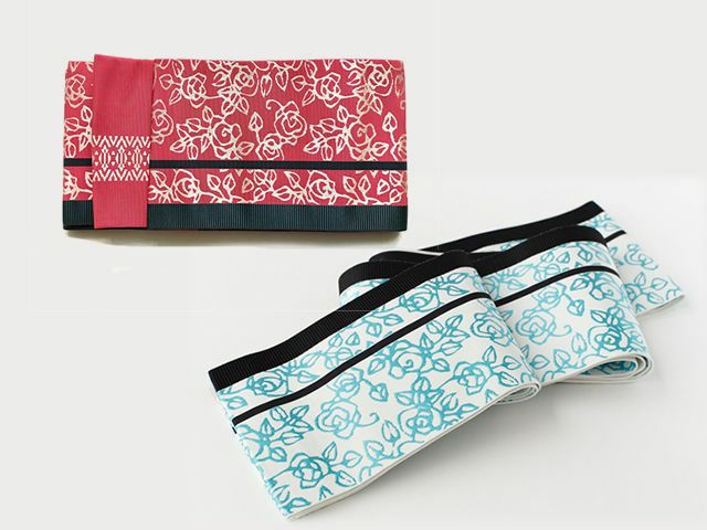 そんな気持ちにお答えして、博多織の有名な織元「西村織物」とのコラボ企画によって、素敵な半幅帯が出来上がりました。デザインはKIMONO MODERN。ちょっぴり大正モダン、ちょっぴりレトロなバラ柄をモチーフに、ココロトキメク2色展開です。