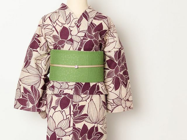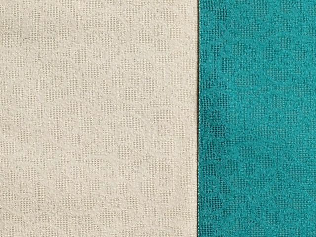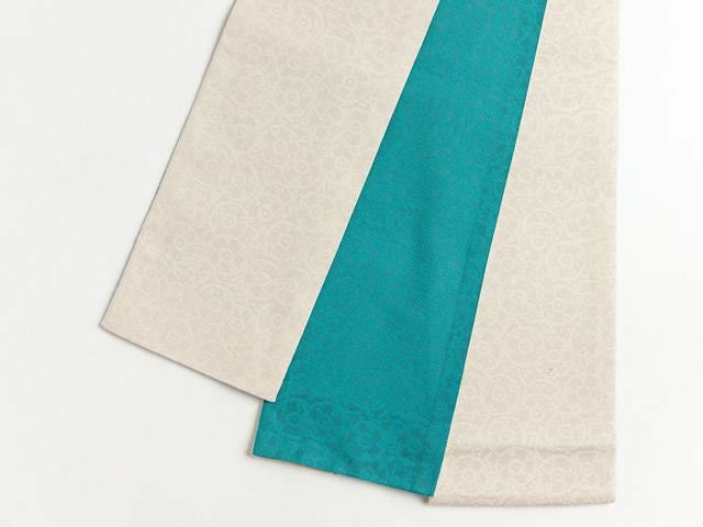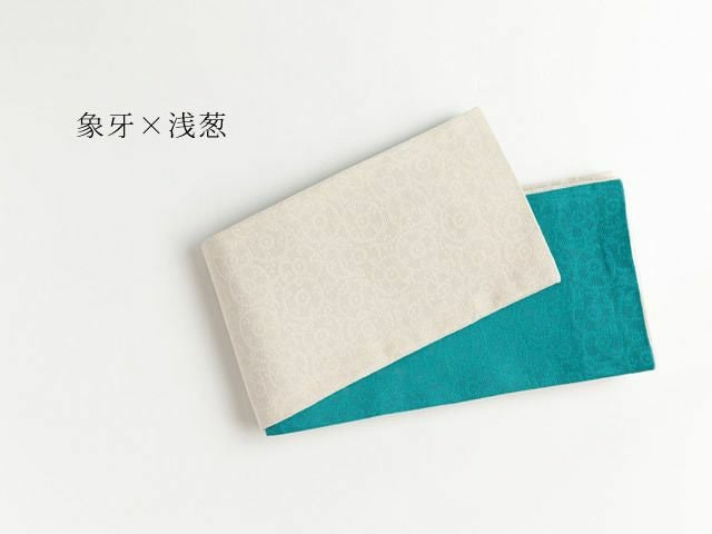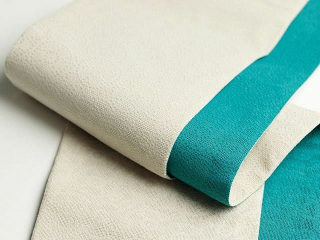 どんな色の着物にも万能な象牙に加えて、キリッと差し色効果の高いターコイズ。困った時のお助け帯、に1本は持っていたい半幅帯です。