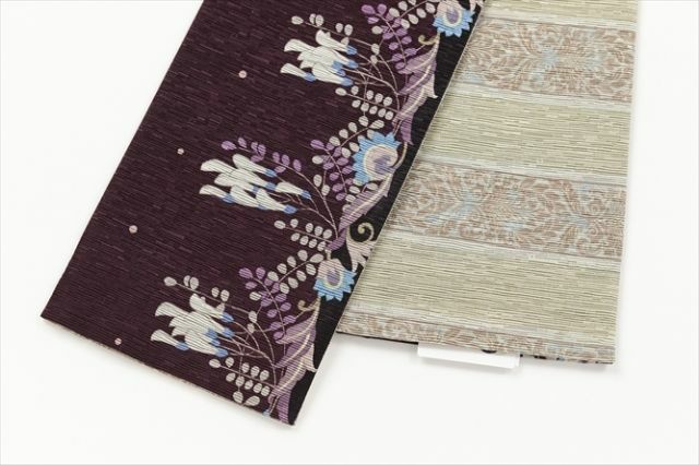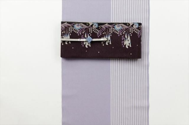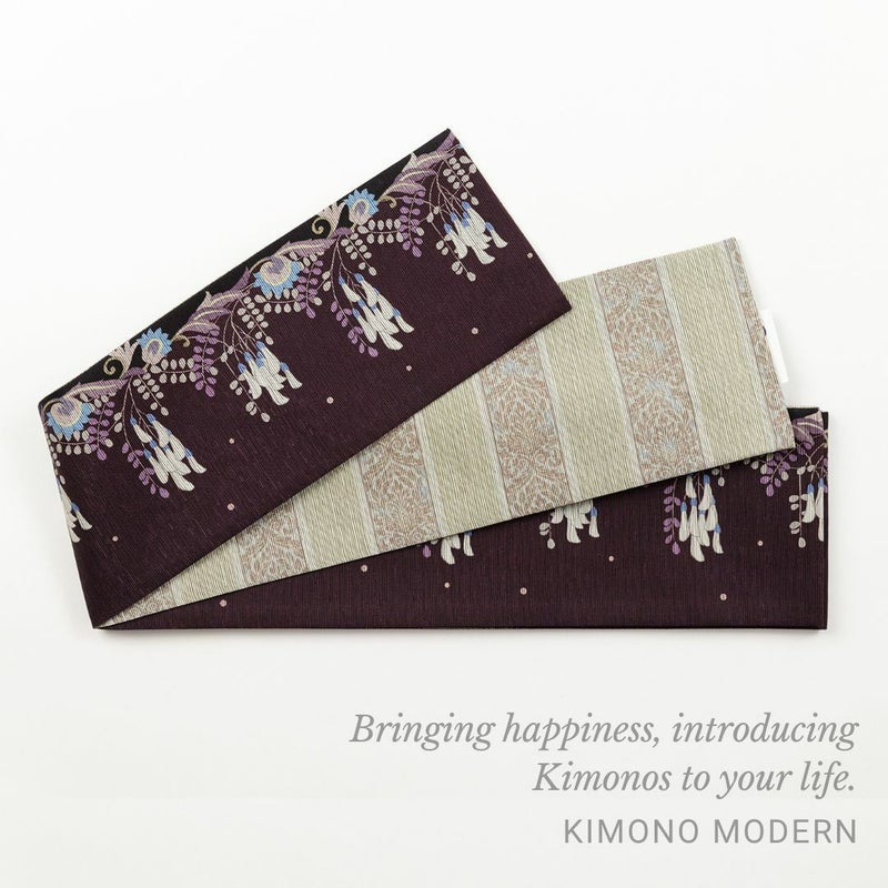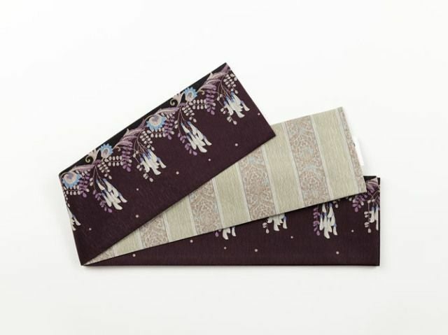 表面には藤の花と実、裏面にはエキゾチックな模様をあしらったストライプがデザインされた半幅帯が登場。