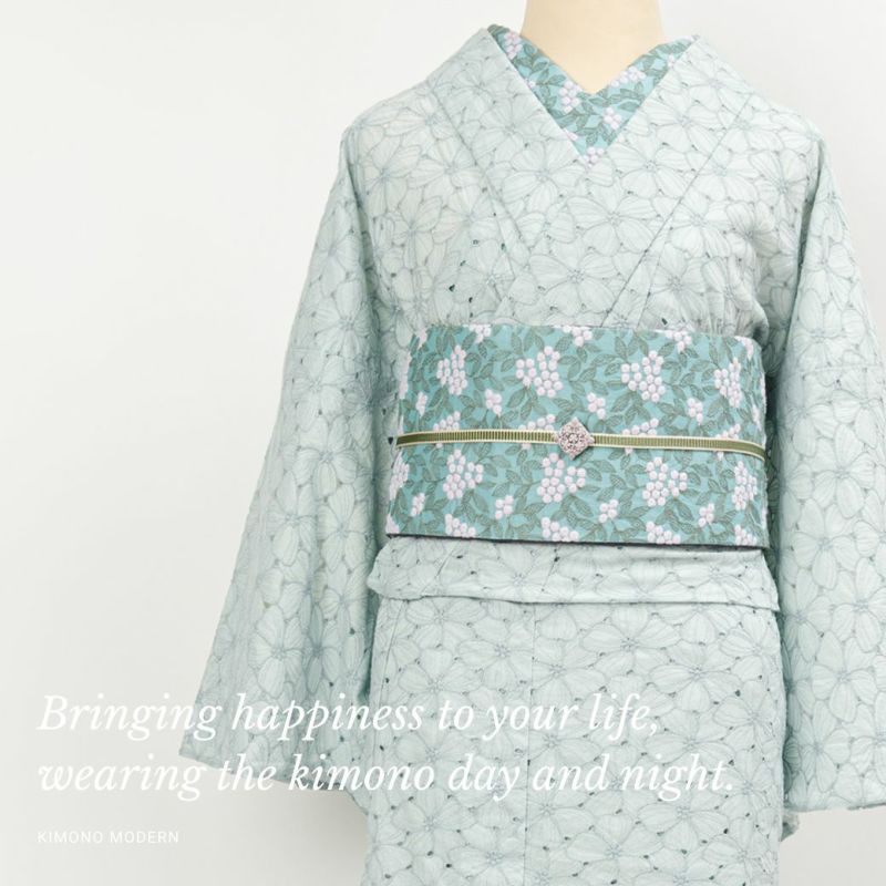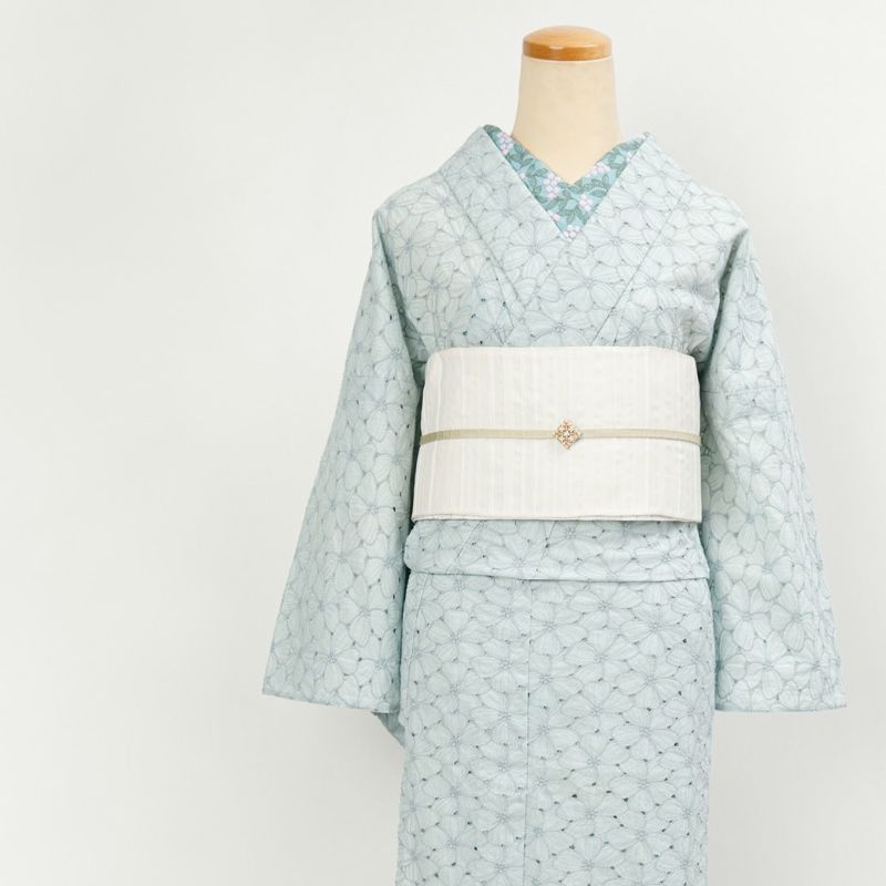 生地そのものは薄手ですが、刺繍の厚みがあるので一般的な木綿キモノと同じような感覚でお召しいただけます。レースなので暑いと感じられなければ夏でも着用は可能ですが、例えば黒曜石などは見た目にもちょっと真夏は暑いと感じられるかと思います。冬場の着用も特に寒さは感じません。見た目の印象によって、着用の季節も変わるかと思います。