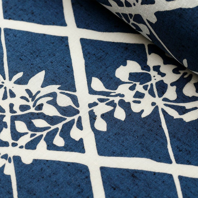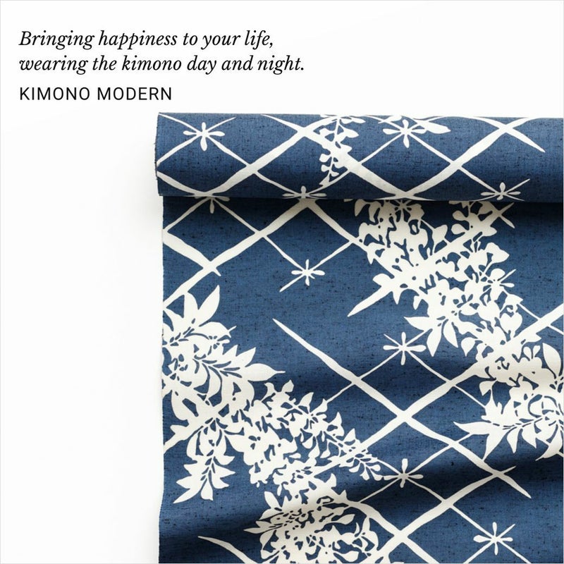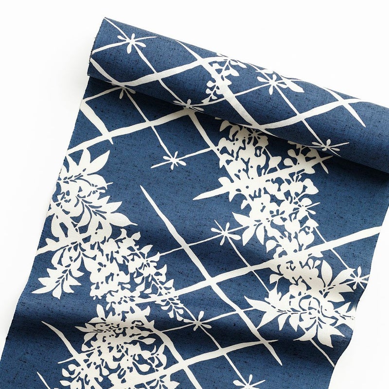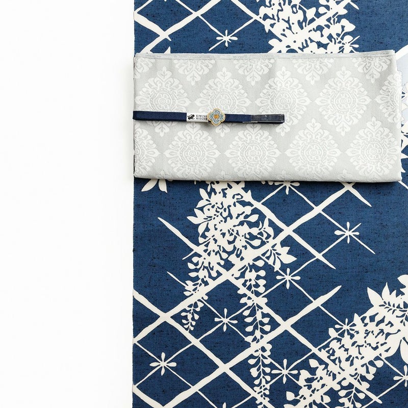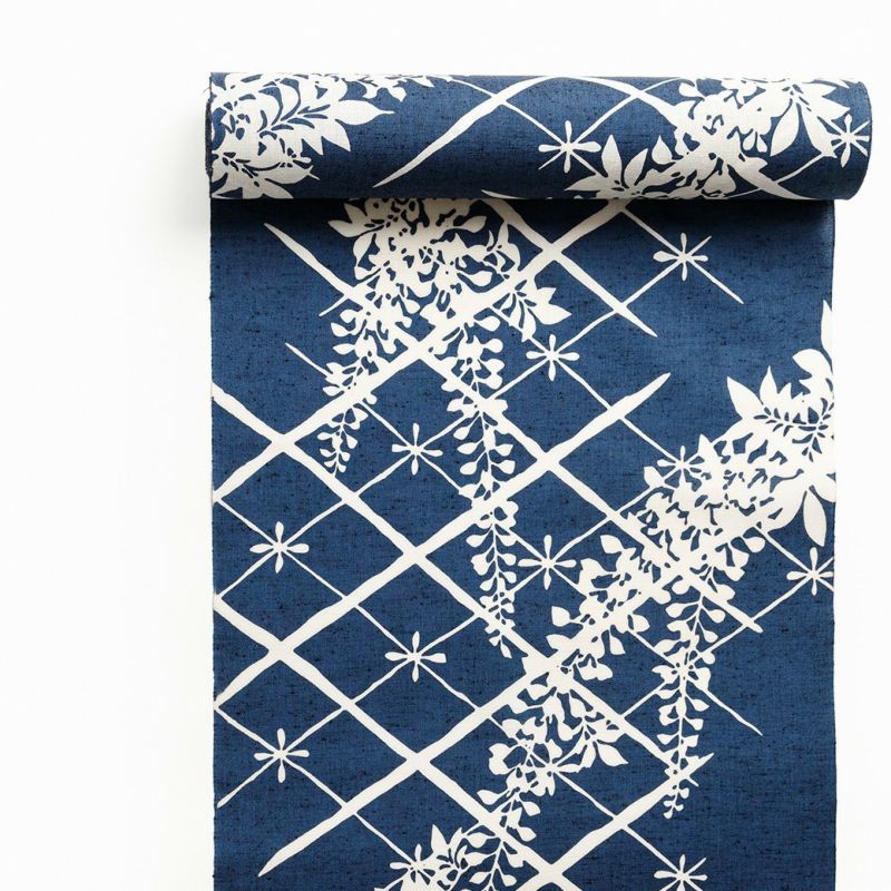 風に揺れる枝垂れ藤の柔らかい動きが表現された、繊細な注染染めに感嘆。錆紺のような褪せた紺地も、アンニュイな表情で目を引きます。