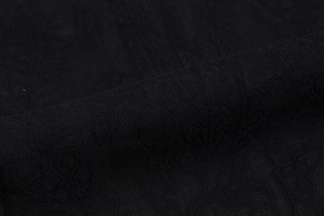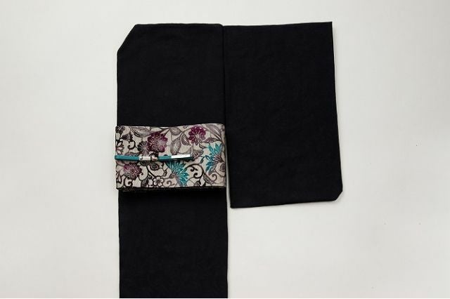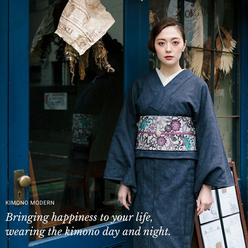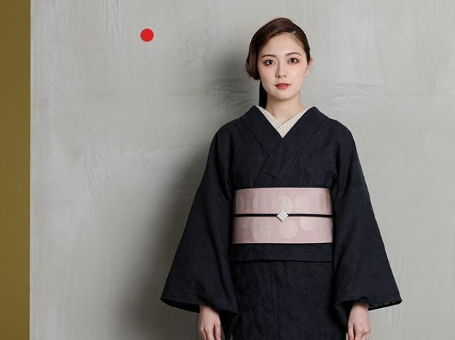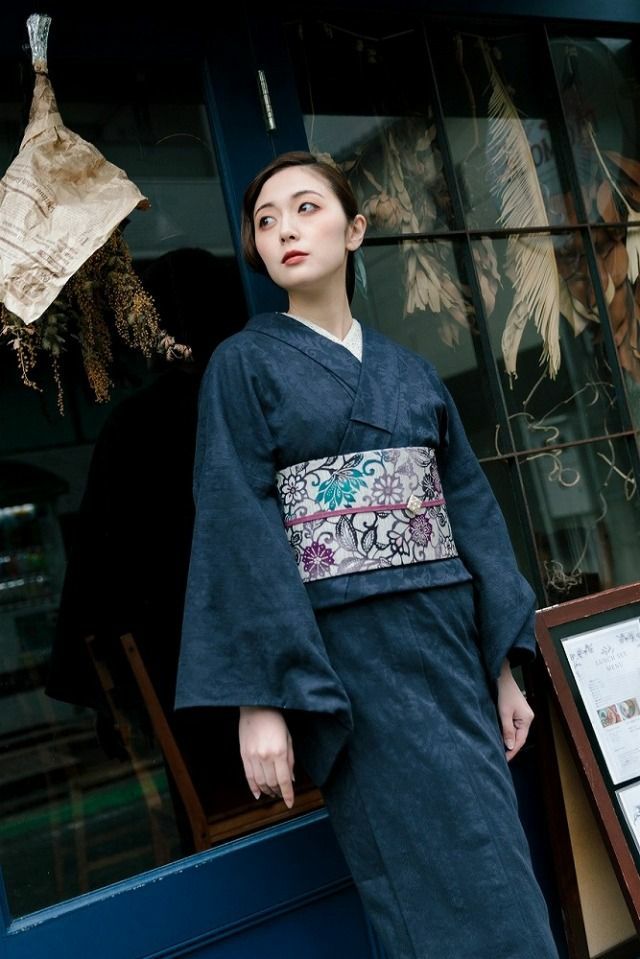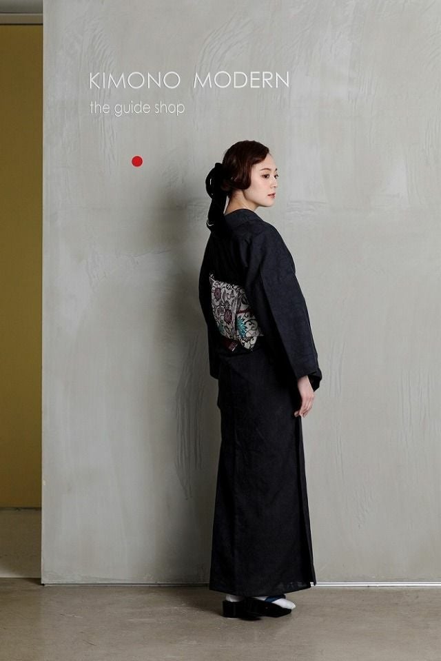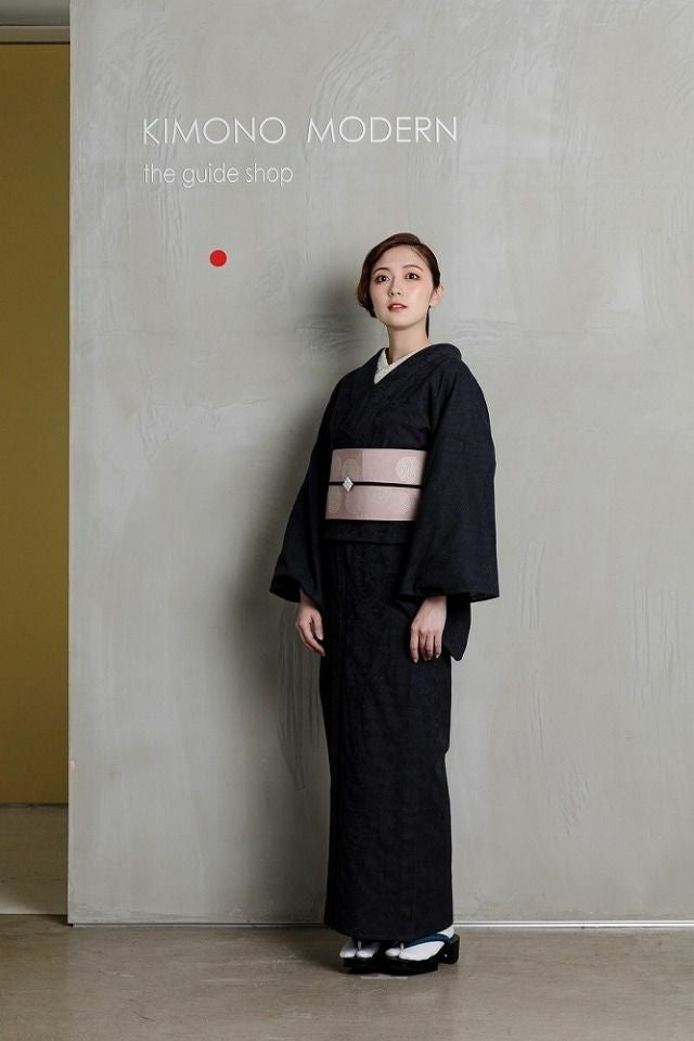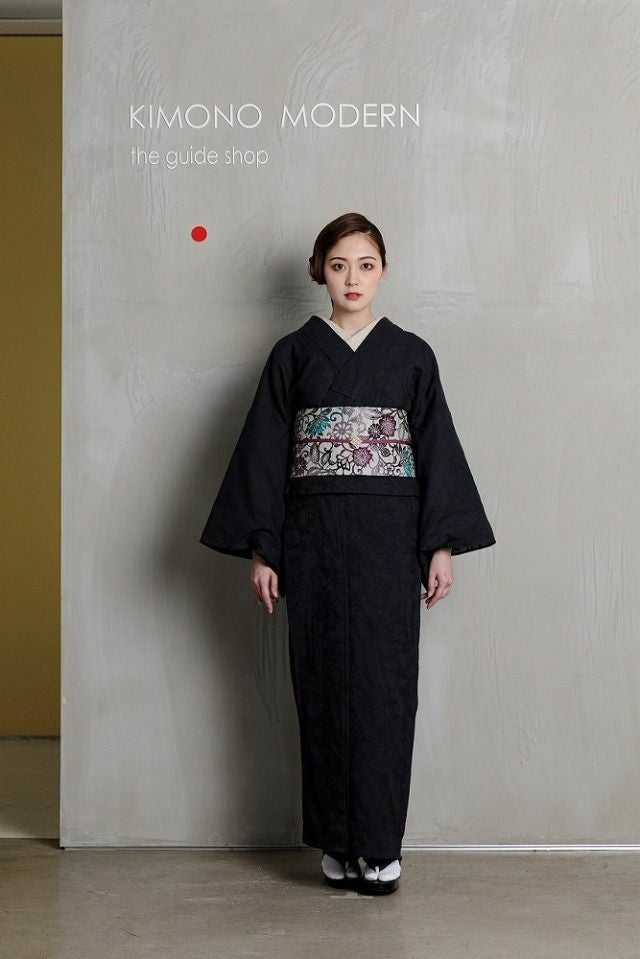 細かな編み目のような生地に浮かび上がる、花鳥風月文様が、一見無地のように見えるシックな着物をクラスアップしてくれます。