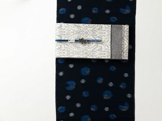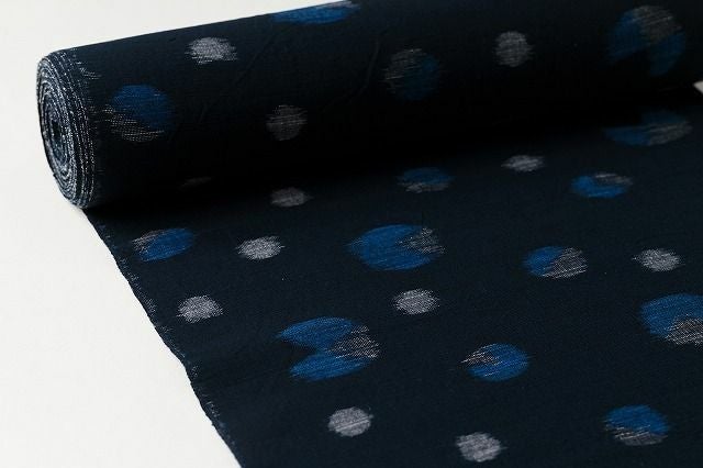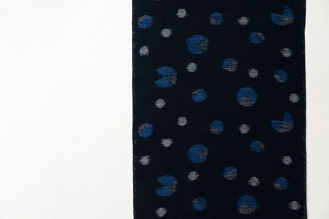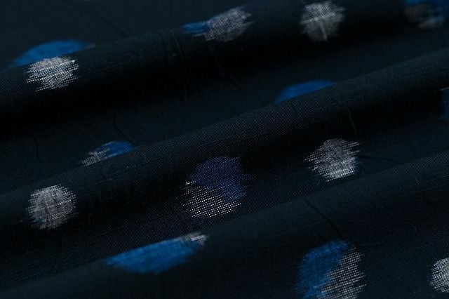 大小の水玉がリズミカルに奏でる、楽しさ。なんだか懐かしい、パックマンみたいな形の水玉と白の水玉の重なりが、ありそうでなかった久留米絣。