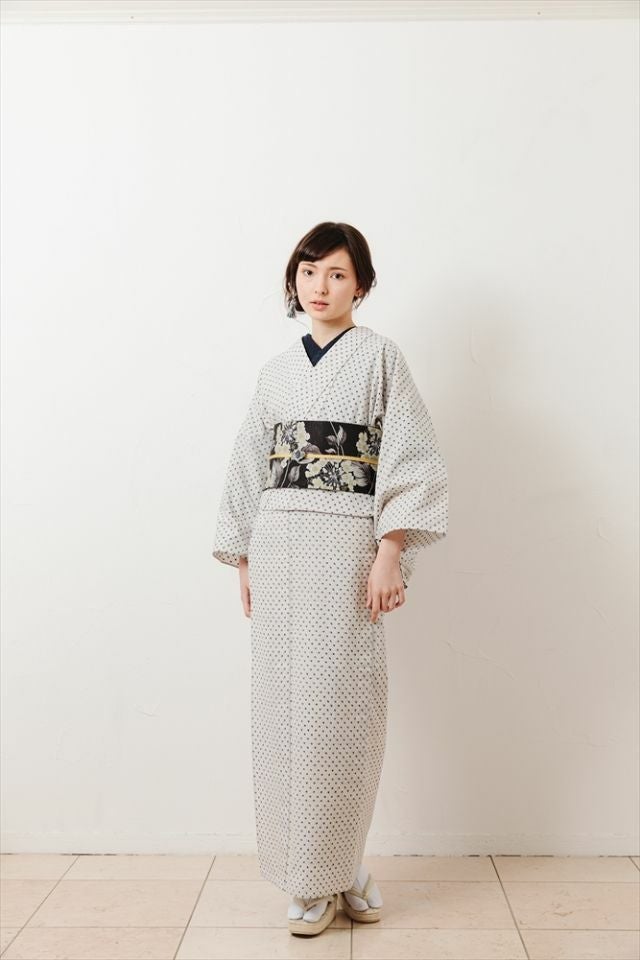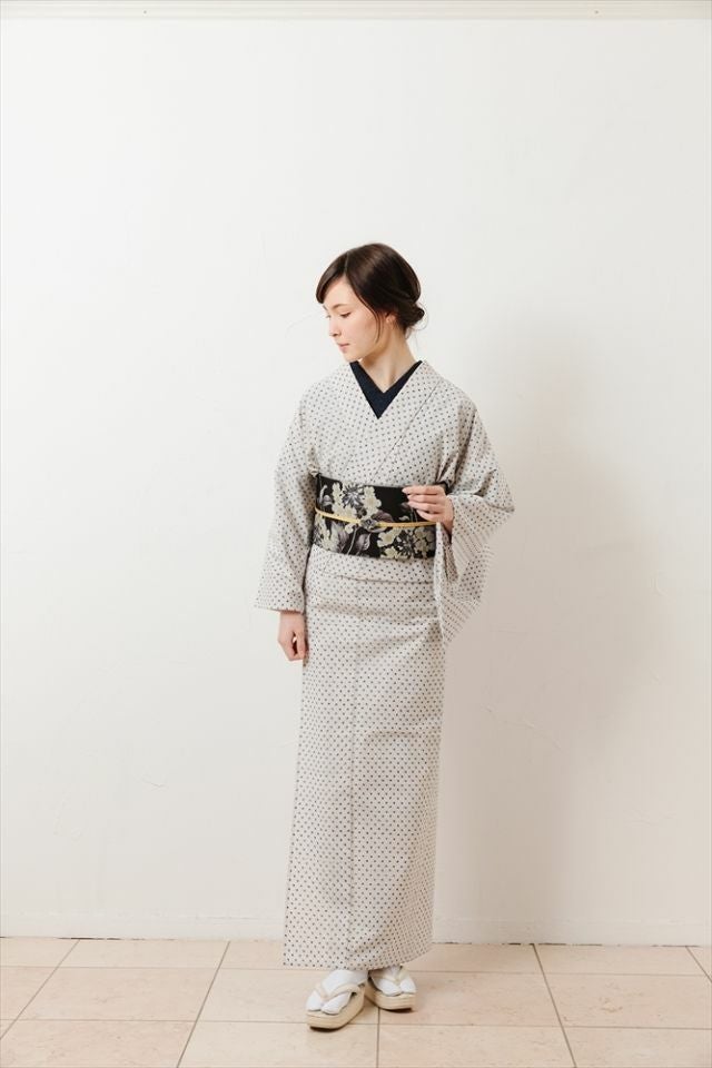 一面に散りばめられた小さなドット柄、いわゆるあられ模様は久留米絣の伝統的な柄のひとつ。絣模様の温かみのある織りのニュアンスが平面的な着物に立体感を与え、より洗練感のある装いに。